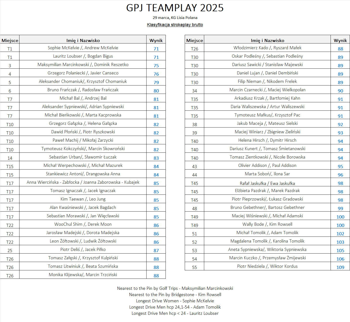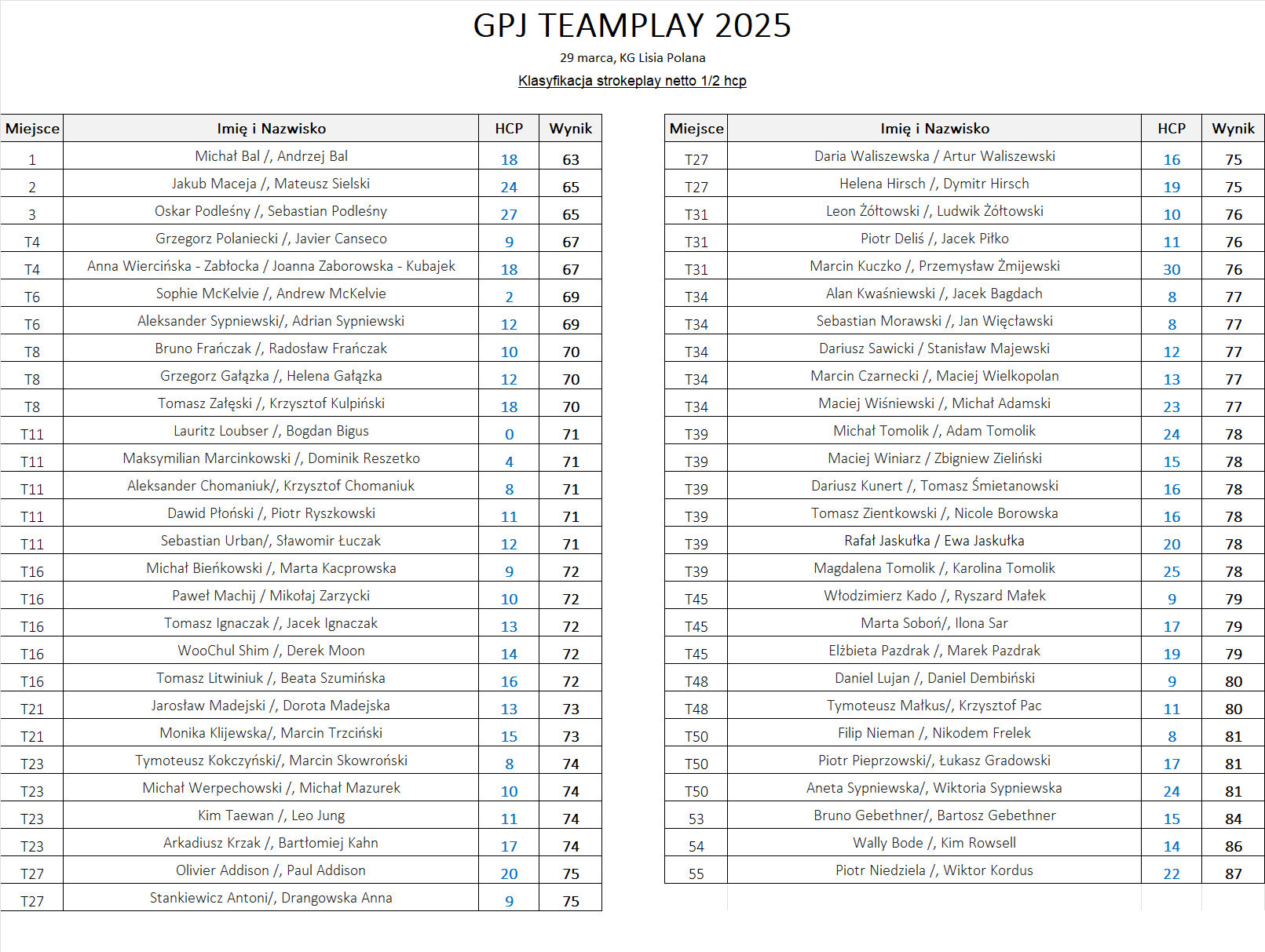 55 par - łącznie 110 graczy rozpoczęło z nami dzisiaj sezon w Klub Golfowy Lisia Polana biorąc udział w GPJ Teamplay 2025 - Turniej Otwarcia Sezonu.